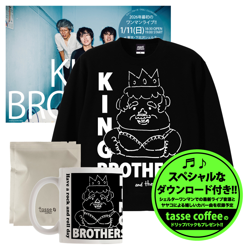 17-Jan-2026 NEW!! 特設サイトにて5日間限定で受付開始!!! ユニークなマグカップが登場!嬉しいダウンロード特典 & tasse coffeeの美味しいドリップパック付きで5日間限定で販売受付開始!!! 期間限定の特設GOODSサイトにて1/21(水)23:59まで受付中!!! ![]() ![]() ![]() ![]() 左上) ダウンロード音源付き・キングマグカップ(tasse coffee付き) 3900円 NEW!! 右上)【サイン入りポスター付き・送料無料】ダウンロード音源付きマグカップ(tasse coffee付き)+あったかスウェット 10500円 NEW!! 左下) ダウンロード音源付き・キングマグカップ(tasse coffee付き)+BAG 7500円 NEW!! 右下) ダウンロード音源付き・キングマグカップ(tasse coffee付き)+Tシャツ9300円 NEW!! 2026年1月11日(月)に下北沢シェルターにて開催された今年最初のワンマンライブ『KING BROTHERS ONEMAN LIVE 2026』にてO.A.にて登場してくれたthe yayakoの荒井氏によるユニークなイラストを使用したマグカップが登場しました、特典としてこの日のライブの模様と、the yayakoによるキングブラザーズの嬉しいカバー1曲を収めたダウンロード音源、そして #キングブラザーズで推し活 にて沢山の協力を頂いた東京都世田谷区代田にある自家焙煎の美味しい珈琲店「tasse」のコーヒーパック2個をお付けして2月下旬より発送いたします、その他会場で販売されたコットンバッグ、Tシャツ、裏起毛のあったかスウェットなど、東京ワンマンに参加できなかったアナタも購入できる最後のチャンスです、是非ユニークなカップで「tasse」の美味しいコーヒーと一緒にこの日のライブ興奮をお楽しみ下さい。 期間限定特設グッズサイト https://kingbrothers.thebase.in KING BROSその他のイベント出演情報!! ![]() 26年 1月29日(木) 大阪・心斎橋 ジャニスNEW!! 【EMERGED MUSIC ASIA TOUR OSAKA】 1/29(木) 心斎橋JANUS 【Guest】KING BROTHERS DrunkMonk(台湾) あすなろ白昼夢 私の思い出 open 18:30 ![]() 入場特典の缶バッジは数に限りがあるので、ご予約はお早めに!! 普段とは違うライブ環境に加えて様々な出店もあったりと特別な1日になるはずなので是非!! ![]() 26年 2月6日(金) 神戸・長田 Daniel factoryNEW!! 長田の鉄工所で完全予約制ライブ開催!! 来場者特典有り!! 2/6(金) -Venue- 神戸 Daniel factory -act- 50/50's ALKASIKA -Special guest- KING BROTERS -Shop- mzizm RAN LUCKEY 福腹飯店 さぼてん堂 余所見(福岡) 出演者フリマ Open 18:00 Charge ¥3000(完全予約制) ![]() 26年 2月10日(火) 大阪・難波メレ NEW!! 2026年2月10日(火・祝前日) 難波Mele15周年特別企画 Special Two-Man Show OPEN 18:45 START 19:30 AD ¥4800 DOOR ¥5300 +1D 出演:POLYSICS VS KING BROTHERS チケット/入場順: @難波Mele店頭チケット ※販売開始→11/2(日)難波Meleにて開催のキングブラザーズワンマン終演後 Aイープラス 販売リンク → https://eplus.jp/sf/detail/4427000001-P0030001 販売開始→11/3(月祝)12:00〜 B当日券 前売チケットはメレ店頭とイープラス、 店頭チケットは11/2(日)のKING BROTHERSツアーファイナル公演の終演後から最速販売! イープラスは翌11/3(月)12:00〜! 03-Nov-2025 NEW!! 今夜は月に一度の3時間生放送ラジオ!! 毎月第一月曜の21時からはキングブラザーズの3時間の生ラジオ 『ロックンロールハイスクール』がさくらFM(78.7Mhz)よりON AIR!! さくらFM(78.7MHz)は全国各地で視聴可能!!! ![]() "キングブラザーズのロックンロールハイスクール" 西宮さくら(FM 78.7MHz)にて、毎月第一月曜の21時〜24時までの3時間生放送中の、 キングブラザーズがメインホストを努めるスペシャルラジオプログラム、 毎回スペシャルなゲストに加え、レギュラーゲストにタワーレコード神戸店・トラヴィス黒田氏、 神戸で活躍するシンガーソングライター・リーテソン氏、レコードレーベル至福千年音盤より 代表ワタナベエイゾウ氏などを迎え、キングブラザーズと一緒に様々な音楽やアートを探求する三時間、 サイマル放送で全世界視聴可能、皆様からのリクエストやメッセージもお待ちしております! 番組中も(#KingBrosRRHS)でどしどし盛り上がろう! メッセージ & リクエストは以下のボタンをクリック ※番組名は「Do The Right Thing」を選択 次回は26年2/2(月)21時より三時間の生放送!! ーーーーーーーーーーーーーーーーーーーーーーーーーーーーーー ロックンロールハイスクールは全世界で視聴可能! 【パソコンからは】 http://sakura-fm.co.jp にアクセスして「さくらFM」の「放送を聴く」をクリック 【スマートフォンからは】*リンク先が変更されたようです https://www.jcbasimul.com/?radio=sakura-fm にアクセスして「さくらFM(ラジオ)を聴く」ボタン 番組内容は#で盛上がろう! #KingBrosRRHS ーーーーーーーーーーーーーーーーーーーーーーーーーーーーーー