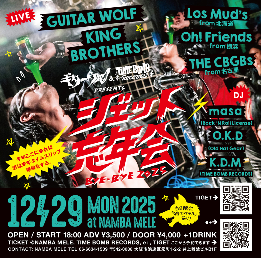 前売:難波メレ、TIME BOMB RECORDS、 e+ 発売中 前売り予約は、TIGET で受付中! ※ 会場、タイムボム で前売り販売、予約受付中 出演 ![]() ![]() 26年 1月10日(土) 兵庫・神戸でのサーキットイベントNEW!! キングブラザーズは1/10(土)神戸バリットに登場!! 特設サイトより : 「KOBE ROCK’N ROLL CIRCUS」とは 『港町・神戸・三宮の街を日本のロックンロールの聖地に!』を標榜し、2019年にスタートした「KOBE ROCK’N ROLL CIRCUS」。ご来場のお客様、出演バンドの皆さんのおかげで、毎年、回を重ねることに大きく成長しているライブハウス・サーキット・イベントとなりました。7回目の開催となった2025年は、初の2days開催に挑戦。2日間に渡って三宮の街を多数のロックンロール・ファンが周遊、闊歩するという景色を生み出すことができました。そして、2026年も2daysでの開催が決定。『港町・神戸をロックンロールの輸出入の街に』を実現できるよう、推し進めていきます! 【日程】 2026年1月10日(土) / 11日(日) 【時間】 リストバンド交換 / VARIT. 開場:12:00 VARIT. 開演:13:00 【会場】 VARIT. / CHICKEN GEORGE / RINKAITEN / Starting Over / THE CASTLE / BLUE PORT / D×Q 【出演】 1/10(土) THE NEATBEATS / The Courettes / 円盤少女 / (The) SEGARE KIDS / Johnny Pandora / THE NUGGETS / UNCLE JOHN / THE DO DO DO's / 蟹光船 / TAROS / the myeahns / the Tiger / THE PRIVATES / THE BLACK DOLPHINS / オータムス / YAPOOL / hotspring / イヌガヨ / モンスターロシモフ / the imitation hearts / Mikabomb / 鈴木実貴子ズ / THE S.O.S / Muddy Jackets / FRUITSinJELLY / ザ・サイクロンズ / Bon Kuhara / Rozzo / THE CLOCKWISE / Sally Fizz Robber / Nevera / ruggirl / Patrick&Patricia / ザ・キャプテンズ / 伊藤陵太郎(Merg Lou)/ THE LET'S GO's / 自爆 / 赤いくらげ / くじけな / サー・ガーヴィンズ / 寝たふりナッパーズ / 寺嶋倶楽部Z / ネモトラボルタ / The howlin' dogs / The Amaretts / まなつ / フリージアン / KING BROTHERS 他〜 1/11(日) THE NEATBEATS / 千年メモリーズ / KiNGONS / 忘れてモーテルズ / 騒音寺 / 流血ブリザード / 333 / 鮫肌尻子とダイナマイト / キノコホテル / ザ・ビートモーターズ / THE抱きしめるズ / ADDICTION / ムステインズ / 片山ブレイカーズ&ザ☆ロケンローパーティ / ELECTRIC EEL SHOCK / SHOTGUN RUNNERS / 福 / ザ50回転ズ / Kensuke Sudo / THE こうがんず / B.I.B.S. / タバタヒナ / Mr.ワリコメッツ / The Dahlia / 武装衝突 / TOM-ATOM / THE FATS / The Spanky Muds / THE PENNY 13 / ザ・あどばん / メルシー / 50/50's / 平田ぱんだ(THE BOHEMIANS)/ 百々和宏(MO'SOME TONEBENDER)/ CHIE HORIGUCHI / フーテン族 / THE KING OF ROOKIE / THE PERRY / The Deadvikings / QUINCAMPOIX / 秘密のコペカチータとザ・チャンス神戸支店 / 黒猫CHELSEA / ウルフルケイスケ with 空団地 / 小山田壮平 / アフターアワーズ / つしまみれ / SA / 他 【料金】 [先行2daysチケット通信販売情報] 9/1 up コンプリートパック(一般):https://jmkobe.base.shop/items/117182871 18,700円 コンプリートパック(25歳以下):https://jmkobe.base.shop/items/117182981 12,800円 ※「2daysチケット+ドリンクチケット(2枚)+リストバンド+記念Tシャツ」を年内に自宅にお届けします! ↑ 終了しました。たくさんのお申し込み、ありがとうございました! [1dayチケット情報] 9/14 up ![]() 26年 2月10日(火) 大阪・難波メレ NEW!! 2026年2月10日(火・祝前日) 難波Mele15周年特別企画 Special Two-Man Show OPEN 18:45 START 19:30 AD ¥4800 DOOR ¥5300 +1D 出演:POLYSICS VS KING BROTHERS チケット/入場順: @難波Mele店頭チケット ※販売開始→11/2(日)難波Meleにて開催のキングブラザーズワンマン終演後 Aイープラス 販売リンク → https://eplus.jp/sf/detail/4427000001-P0030001 販売開始→11/3(月祝)12:00〜 B当日券 前売チケットはメレ店頭とイープラス、 店頭チケットは11/2(日)のKING BROTHERSツアーファイナル公演の終演後から最速販売! イープラスは翌11/3(月)12:00〜! 03-Nov-2025 NEW!! 今夜は月に一度の3時間生放送ラジオ!! 毎月第一月曜の21時からはキングブラザーズの3時間の生ラジオ 『ロックンロールハイスクール』がさくらFM(78.7Mhz)よりON AIR!! さくらFM(78.7MHz)は全国各地で視聴可能!!! ![]() "キングブラザーズのロックンロールハイスクール" 西宮さくら(FM 78.7MHz)にて、毎月第一月曜の21時〜24時までの3時間生放送中の、 キングブラザーズがメインホストを努めるスペシャルラジオプログラム、 毎回スペシャルなゲストに加え、レギュラーゲストにタワーレコード神戸店・トラヴィス黒田氏、 神戸で活躍するシンガーソングライター・リーテソン氏、レコードレーベル至福千年音盤より 代表ワタナベエイゾウ氏などを迎え、キングブラザーズと一緒に様々な音楽やアートを探求する三時間、 サイマル放送で全世界視聴可能、皆様からのリクエストやメッセージもお待ちしております! 番組中も(#KingBrosRRHS)でどしどし盛り上がろう! メッセージ & リクエストは以下のボタンをクリック ※番組名は「Do The Right Thing」を選択 次回は26年1/5(月)21時より三時間の生放送!! ーーーーーーーーーーーーーーーーーーーーーーーーーーーーーー ロックンロールハイスクールは全世界で視聴可能! 【パソコンからは】 http://sakura-fm.co.jp にアクセスして「さくらFM」の「放送