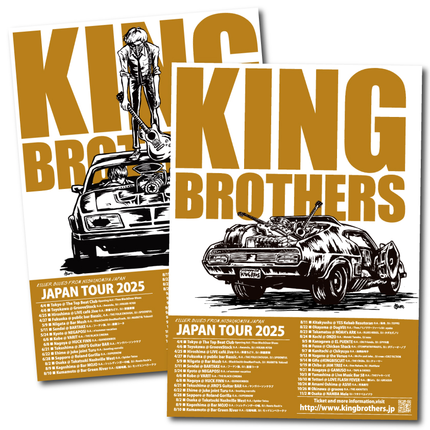 18-Dec-2025 NEW!! 今年のツアーアイテムが購入できる特設サイトも期間限定オープン!! ツアーファイナルで登場したあのアイテムもいよいよ購入可能!買い逃したアイテムもGETできる最後のチャンスです!なお先着50名様には両面プリントされたA3サイズのポスターもプレゼント! 期間限定特設グッズサイト https://kingbrothers.thebase.in ![]() ![]() 完全受注生産のスペシャルアイテムが遂に発売!左)Tシャツ 5800円、右)裏起毛スウェット 7800円 ![]() 全て背面にも新たなデザインが印刷された最終バージョンの販売となります(*こちらは在庫終了次第販売終了となります) 先着50名様に両面印刷された特製A3ポスターをプレゼント! 30-Nov-2025 NEW!! 11-Nov-2025 NEW!! KING BROSその他のイベント出演情報!! ![]() 25年 12月27日(土) 大阪・塚本エレバティNEW!! オルタニアジャーニー 師走ネ申スペシャル編 2025.12.27 Sat. at 塚本エレバティ Open17:00/Start17:30 出演 : KING BROTHERS VS SPOILMAN O.A. 新カリチアル Food : 喫茶室ラハト DJ : キング・クウォータ Adv¥4,000/Door¥4,500+1D ![]() チケット : https://tiget.net/events/431621