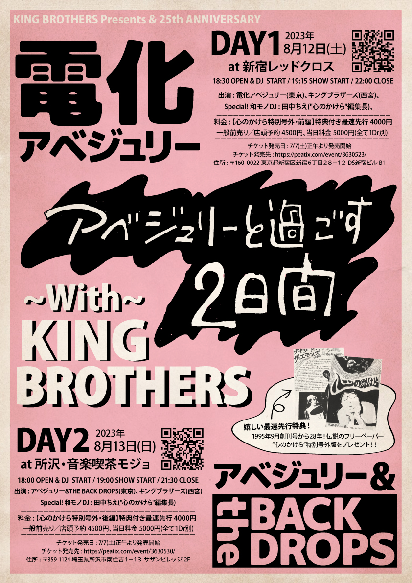 キングブラザーズのアメリカでの2ndアルバム『IN THE RED』のリリースから22年、本作の全編プロデュースを行った恩師アベジュリー(デキシード・ザ・エモンズ)との猛烈な二日間が決定!第一夜目は新宿レッドクロスにて、アベジュリー氏の白いテレキャスターが炸裂するブルージーでグルーヴィーな3ピースバンド”電化アベジュリー"との初めてのツーマン対決が実現!そして第二夜目は美味しい食事と音楽が楽しめる埼玉県所沢の素敵な音楽喫茶モジョにて、キングブラザーズがかつてライバル視していた東京のバンド"the BACKDROPS”が密かに復活していた事が判明、なんと彼らをバックバンドに迎えた奇跡の編成"アベジュリー&the BACKDROPS”との貴重な第二夜目を開催!しかもなんと両日当時デキシード・ザ・エモンズの関西のファンクラブを支え、キングブラザーズには結成直後に音楽の知識を与え続けたこちらも恩師”たなちえ(田中ちえ)”がDJに登場し、超濃厚な和モノ・レアレコードもスピンしまくる二日間!最速先行特典にはかつてキングブラザーズも愛読していた超激ヤバなフリーペーパー”心のかけら(23年版・号外!) by たなちえ作”が来場者プレゼントとして両日別内容の物として特別配布!キングブラザーズ25周年記念イベントとして是非貴重な二日間を体感してください。